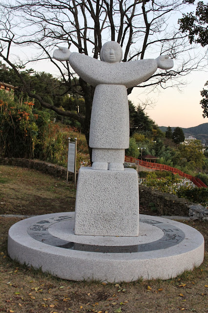 Me køyrte istadenfor inn i byen Tongyeong og besøkte Tongyeong Nammangsan Open Air Sculpture Park. Der fekk me nyta solnedgang og flotte skulpturar.